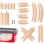 A praktikus készlet 20 darab fa sínelemet tartalmaz vonatpályákhoz, melyek strapabíró műanyag dobozban vannak a könnyű tárolás érdekében. Ideális bővítés gyermek vasútjátékokhoz, 3 éves kortól ajánlott és CE-megfelelőséggel rendelkezik.