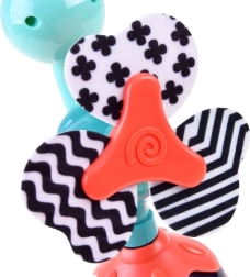 Az erős gumitapadókorong biztonságosan a helyén tartja a játékot az etetőszék tálcáján, az asztalon vagy más sima felületen, így még lelkes játék közben sem gurul el.