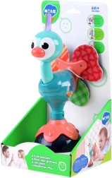A bájos páva sima műanyag részeket és puha textil elemeket kombinál a farkán, hogy változatos textúrákat és ingereket kínáljon a babának. A játék a tapadókoronghoz rögzítve saját tengelye körül forog, és mozgás közben finom csörgő hangokat ad ki, amelyek a gyerekeket megfogásra és felfedezésre ösztönzik.