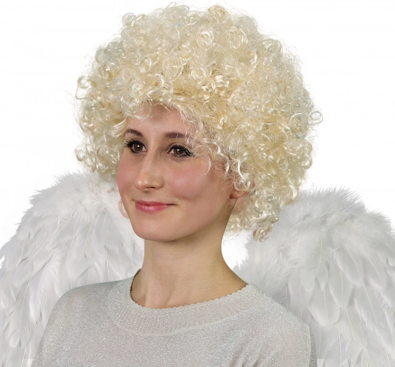 A rövid szőke paróka afro göndör tincsekkel néhány másodperc alatt feldobja angyalkosztümödet, és biztosítja a kihagyhatatlan megjelenést.