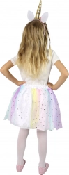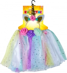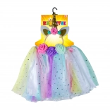 Változtasd gyermekedet varázslatos unikornissá ezzel a színes jelmezzel, amely tartalmaz egy tüllszoknyát és egy unikornisos hajpántot. Ez a szett tökéletes azoknak a gyerekeknek, akik szeretnének mesés kalandokat átélni játék közben. A szoknya színes tüllel és csillagmintás díszítéssel készült, rugalmas derekának köszönhetően pedig könnyen igazodik.