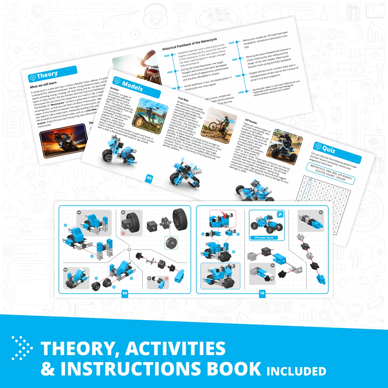 A nagy teljesítményű, fogaskerék-áttételes, nagy nyomatékú motor életre kelti a modelleket. A készlet támogatja a STEM (tudomány, technológia, mérnöki tudomány, matematika) elveit, és motiválja a gyerekeket a kísérletezésre, illetve saját konstrukciók megalkotására.