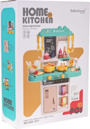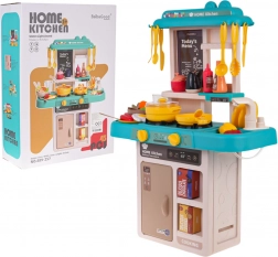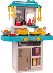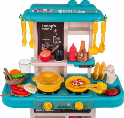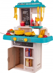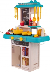 Ez a gyerekkonyha trendi kék–türkiz árnyalataival kis bisztróvá varázsolja a szobát. Az interaktív főzőlap a gombok elfordítására főzési és sütési hangokat ad, és megvilágítja az égőket. A csapból valóban folyik a víz, így a gyerekek a „főzés” után leöblíthetik az edényeket, akárcsak egy igazi konyhában.