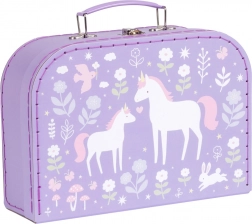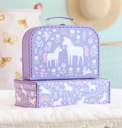 Az A Little Lovely Company két dekoratív bőröndből álló szettje játékos dizájnt kínál egyszarvúakkal, szivárvánnyal és virágokkal lila alapon. A könnyű, mégis masszív szerkezet ellenálló kartonból, minőségi varrással hosszú élettartamot és kényelmes hordozást biztosít.