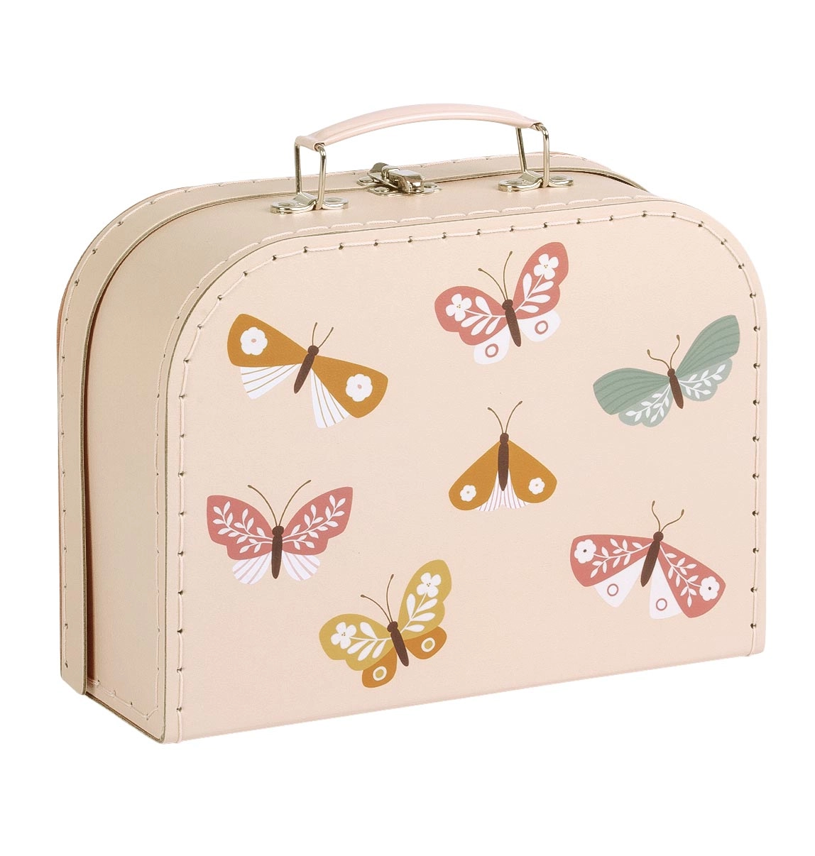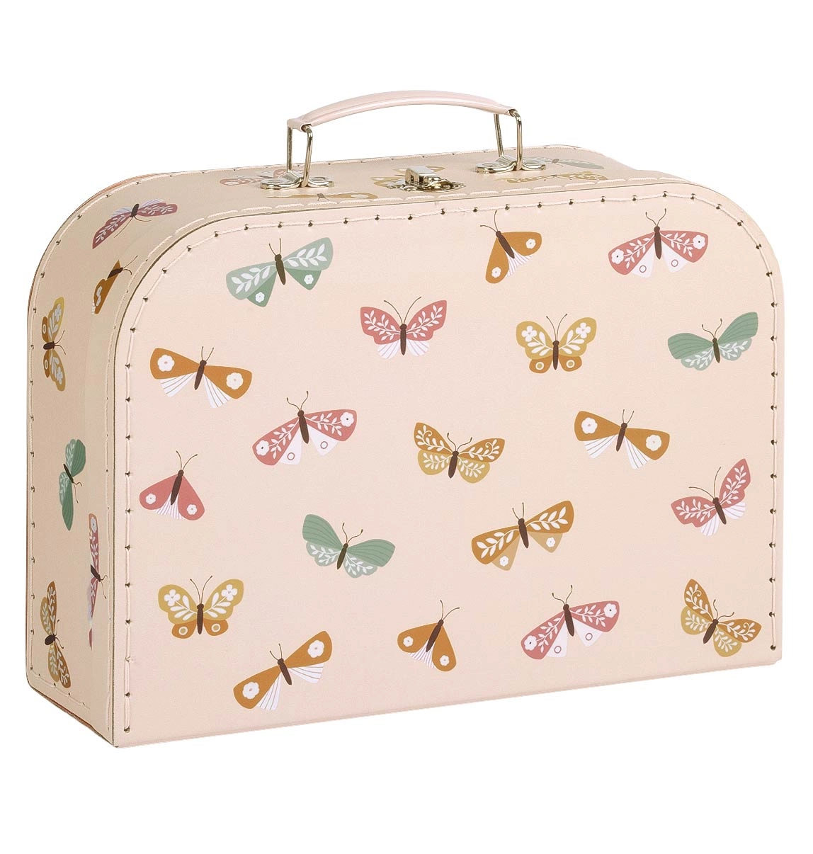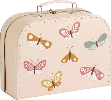 Praktikus és stílusos két darabos bőrönd szett finom bézs árnyalatban, színes pillangó illusztrációkkal – rendet és örömet visz a mindennapokba. A nagyobb és a kisebb bőrönd ideális játékok, ceruzák, füzetek, apró kincsek tárolására, vagy dekoratív tárolódobozként a gyerekszobában.