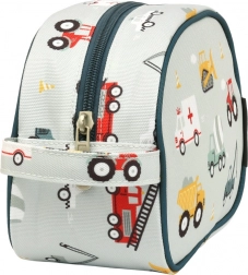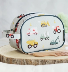 Aranyos gyerek toalett-táska járművek motívummal, ideális kirándulásokra, táborokba és nyaralásra. Tágas fő rekesszel, cipzáras záródással és praktikus füllel a könnyű hordozáshoz. Kompakt méreteinek köszönhetően elfér a hátizsákban, miközben mindent elnyel, ami a mindennapi higiéniához szükséges.