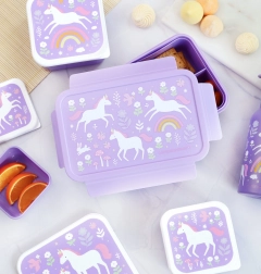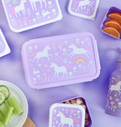 A Little Lovely Company bájos uzsonnás doboza játékos egyszarvús és szivárványos dizájnjával a gyerekek kedvence, átgondolt kialakításával pedig a szülők praktikus segítője. A szorosan záródó tetőnek köszönhetően a tartalom friss és biztonságosan lezárt marad. A két rekesszel ellátott, kivehető tálca lehetővé teszi a áttekinthető elkülönítést gyümölcs, zöldség, pékáru vagy nasi között.