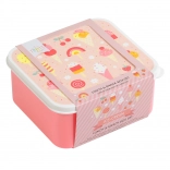 Ez a praktikus készlet négy, egymásba illeszkedő méretű dobozt tartalmaz. Az egységes, fagylaltos dizájn a gyerekeknek és felnőtteknek egyaránt örömet szerez, és feldob minden uzsonnát. Egyszerű záródásuknak köszönhetően alkalmasak a mindennapi használatra otthon, iskolában és kirándulásokon.
