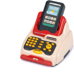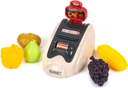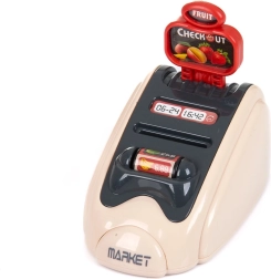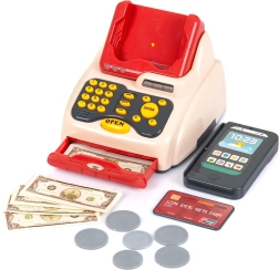 24 darab tartozékot tartalmaz – pénztárgép alap, érmék, bankjegyek, bankkártya, mobiltelefon, élelmiszerek és egyéb kiegészítők,