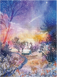 Élvezd a békés téli pillanatokat a GALISON „Elvarázsolt havas táj” kirakóval, 1000 darabbal. Laivi Põder illusztrációja egy kunyhót ábrázol csillagos égbolt alatt, élénk kék és lila tónusokban. A kirakó újrahasznosított papírból készült, nem mérgező festékekkel nyomtatva, matt felülettel a részletek tökéletes olvashatóságáért.