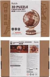 Ez a 3D fa puzzle Rolife Glóbusz lenyűgöz történelmi dizájnnal és olyan szerkezettel, amely a klasszikus földgömböt szimulálja. Nemcsak stílusos belső tér kiegészítő, hanem kiváló eszköz a logikai és motorikus készségek fejlesztésére. Fedezze fel a csillagjegyek csillagképeit és a csillagászati szimbólumokat, amelyeket a prágai Óvárosi óratorony ihletett.
