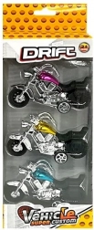 Ez a három élethű mini motorból álló készlet rengeteg szórakozást kínál, és kiválóan bővíti a gyűjteményt. A fém és a műanyag alkatrészek kombinációjának köszönhetően a modellek masszívak és tartósak, valamint gazdag részleteikkel – a kormánytól az ülésen át a „krómozott” elemekig – örömet szereznek. Kompakt méretüknek köszönhetően jól illeszkednek a gyerekek kezébe.