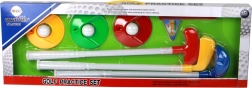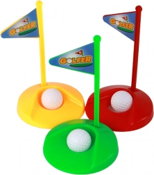 Ez a színes minigolf készlet mindent tartalmaz, amire a gyerekeknek szükségük van a játékhoz: 3 strapabíró ütő (kb. 52 cm), 3 lyuk zöld, piros és sárga színben, 3 rajt zászló és 3 fehér labda (átmérő kb. 3,5 cm). Minden ütő más fejformával rendelkezik, ami stratégiát és változatosságot visz a játékba.