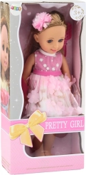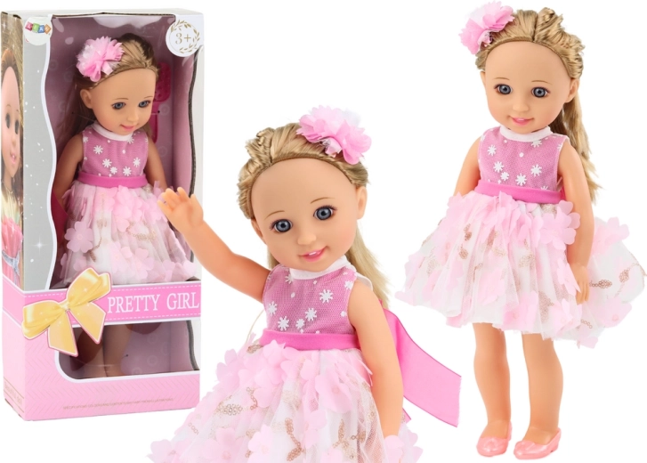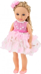 A babának hosszú szőke haja van, amelyet különféle módon lehet formázni, és fésűvel érkezik a haj fésüléséhez és igazításához. A hajat ráadásul egy aranyos csat díszíti, amely különleges hangulatot kölcsönöz a babának. Gyönyörű rózsaszín-fehér ruhát visel, rózsaszín virágokkal és arany kiegészítőkkel díszítve. A ruha elegáns és stílusos, bármilyen alkalomra ideális. A babán rózsaszín cipő van, amely tökéletesen illik a ruhájához. Finom sminkje kiemeli elegáns megjelenését, gondosan megfestett szeme és ajka pedig karaktert és bájt kölcsönöz neki.