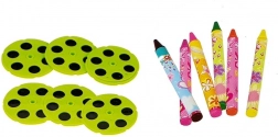 A csomag tartalma: 36 képsablon, 6 vetítőlemez, 12 színes kréta/íróeszköz, valamint betű- és geometriai sablonok.