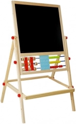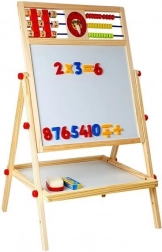 A tábla nélkülözhetetlen felszerelés: a kis művésznő krétával fejlesztheti rajzkészségét, emellett írni és számolni is tanulhat. Praktikus polccal van felszerelve a kiegészítők számára. Masszívan, a legmagasabb minőségű anyagokból készült. Gondosan megmunkált, ezért nincsenek éles szélei. A tábla fekete oldalára krétával rajzoljon – a csomag három színt tartalmaz. Van egy 3 színű golyókból álló abakusza, amellyel a gyermek megkezdi a számolás kalandját, a másik oldalon pedig számos fa kocka található, amelyekkel könnyen elvégezhetőek az alapvető matematikai műveletek. A mágneses számokkal és matematikai jelekkel megtanulhatja az alapműveleteket, mint az összeadás, kivonás és szorzás. Középen óra található, amelyen a kisgyermek a mutatók segítségével beállíthatja az időt és felismerheti az órákat.