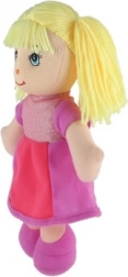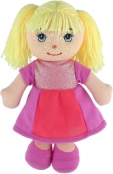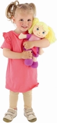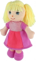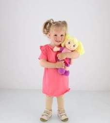 A sárga haj copfokba kötve és a rózsaszín–lila ruhácska serkenti a fantáziát és örömteli játékra hív.
