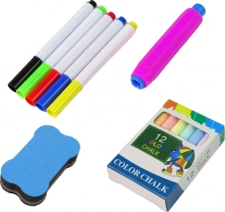 A készletben mindent megtalál: magát a táblát lábakkal, 5 különböző színű filctollat (kék, piros, sárga, zöld, fekete), egy praktikus szivacsot a törléshez, valamint 12 színes krétát (színenként 2 db) a fekete oldalra való íráshoz. A krétatartó lehetővé teszi a rajzolást anélkül, hogy összekoszolná a kezét, a betűket, számokat és jeleket tartalmazó mágneskészlet pedig dinamikus, interaktív tanulást biztosít.