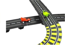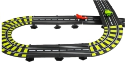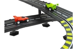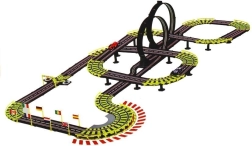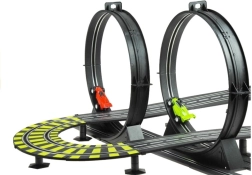Szórakoztató versenyszett gyerekeknek és felnőtteknek, közel 12 méter hosszú pályával, két hurkokkal, körszámlálókkal és 230 V-os tápellátással, elemek nélkül. Tartozék 2 versenyautó, védőkorlátok, híd, lelátók és alagút – minden a gyors párharcokhoz és a biztonságos vezetéshez a sárgával jelölt éles kanyarokban.