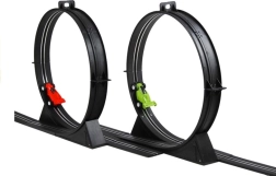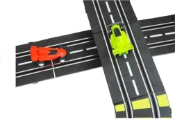 - Komplett készlet: két vezérlő (joystick), 2 versenyautó, körszámlálók, hurkok, híd, dekorációk és zászlócskák.