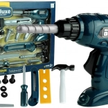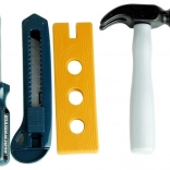 A készletben a gyermek megtalálja: fúrót, kalapácsot, csavarhúzót, cserélhető csavarhúzófejeket, nagy szegeket, csavarokat anyákkal, falécet és tördelhető pengéjű kést. Minden elem a játék közbeni biztonságot és kényelmet szem előtt tartva készült.