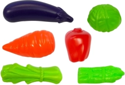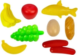 A készlet különféle műanyag élelmiszereket tartalmaz, amelyek bemutatják az egészséges étkezési szokásokat.
