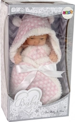 A bábu meleg, rózsaszín babazsákba van öltöztetve, fehér masnival. Mozgatható karjai vannak, ami növeli a játék interaktivitását és realisztikus megjelenését. Kiváló minőségű, tanúsított anyagokból készült, amelyek garantálják a biztonságot és a játék hosszú élettartamát.
