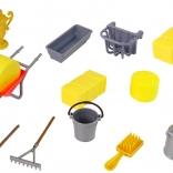 A készlet tartalmazza a farm és istálló napi karbantartásához szükséges eszközöket - tricikli, villa, széna, vályúk és más egyebek.