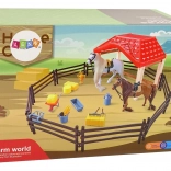 - Az építőkészlet kiegészítőket tartalmaz, mint például triciklik, villák, etető- és itatóvályúk, valamint széna.