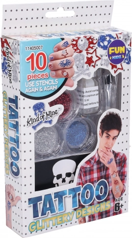 Ideiglenes csillámtetováló készlet fiúknak: 4 újrahasználható sablon, 3 féle csillámpor, ragasztó, ecset és útmutató. Szuper szórakozás 6 éves kortól.