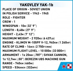 Ezzel az építő készlettel felépítheti a Yakovlev Yak-1b történelmi vadászrepülőgép modelljét, amelyet a légierő a II. világháború során használt. Karcsú kialakítása és egyszerű karbantartása miatt népszerű volt a pilóták és a földi személyzet körében. Ez a repülőgép a kiváló teljesítménye miatt ismert, köszönhetően a jó teljesítmény-tömeg aránynak, ami félelmetes ellenfél volt a levegőben.