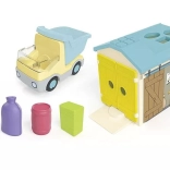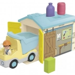- Garázs formaválogató panellel, teherautó horoggal és billenőplatóval, munkás figura, rakomány elemek (zsák, doboz, hordó)