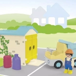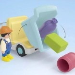 Berakodás után irány az építkezés, majd a plató billentésével a rakomány könnyedén lerakható. A mellékelt építőmunkás figurával saját történetek és jelenetek alkothatók, amelyek fejlesztik a fantáziát és a nyelvi készségeket.