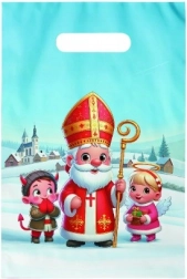 Praktikus műanyag tasak színes Mikulás-mintával, 20 × 30 cm méretben, ideális ajándékok és édességek csomagolásához. A kivágott fogantyúnak köszönhetően kényelmesen hordható, az erős műanyag szakadás- és nedvességálló, a Mikulást, angyalt és krampuszt ábrázoló nyomat ünnepi hangulatot teremt.