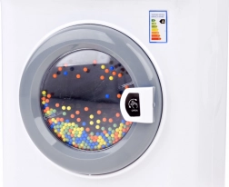 Az átlátszó ajtón át láthatók a színes golyók a dobbal, amely mosás közben forog és vízhatást szimulál.
