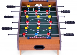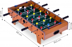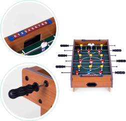 Az ECOTOYS mini asztali foci kiváló választás családi és baráti összejövetelekhez. Két pontszámláló és csúszásmentes fogantyúk biztosítják a kényelmes és könnyű játékot két játékos számára. A faanyagból készült szerkezet kompakt, 70x35 cm-es mérete lehetővé teszi az asztal kis terekbe történő elhelyezését.