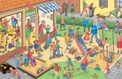 A háztartási jelenetek feje tetejére állnak, és szinte szétfeszíti őket a sok apró részlet. A gyerekek keresgélni fogják, mi a hibás, és saját történeteket mesélnek.