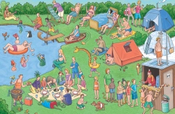Kempingezés, fürdés és nyári játékok a tónál – színes jelenetek, amelyek saját történetek kitalálására hívják a gyerekeket.