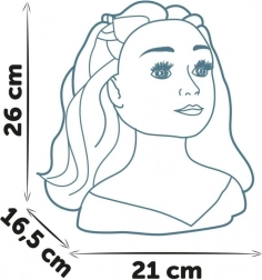 Fésülhető fej trendi frizurák készítéséhez. Varázsfunkcióval: használd a mellékelt, hideg vízbe mártott ajakecsetet, és az ajkak szépen kiszíneződnek. 19 darab kiegészítőt tartalmaz, amelyeket a fej talapzatában található titkos rejtekhelyen tárolhatsz. A talapzat alsó részén tapadókorongokkal a jobb stabilitásért. A fej magassága 26 cm.