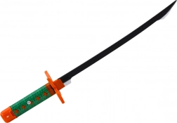 A fekete penge és a feltűnő narancs‑zöld markolat geometrikus mintával autentikus stílust kölcsönöz a kardnak. A könnyű műanyag ideális a gyerekek játékához és a könnyű manőverezéshez.