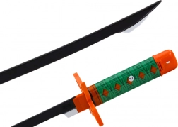 Ez a gyerekeknek készült szamurájkard hűen idézi a legendás Nichirin stílust – fekete pengével és narancs‑zöld, geometrikus mintás markolattal, amely biztos és kényelmes fogást nyújt. A biztonságos műanyag penge kb. 40 cm hosszú, a markolat kb. 15 cm, ami támogatja a biztonságos és kreatív játékot.