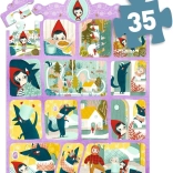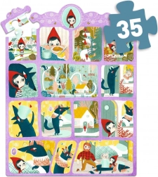 Ez a nagyszerű puzzle a Piroska és a farkas történetét mutatja be, amely képregény formájában van elmesélve. Remek szórakozás családoknak és gyerekeknek, akik egyszerre élvezhetik az összerakást és a mese olvasását. A csomag nemcsak 35 puzzle-darabot tartalmaz, hanem egy posztert a történettel és 3 karton figurát is, amelyek életre keltik a kreatív játékot.