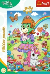 Puzzle csillogókkal Treflík család 100 zseniális darabot kínál, amelyek egy gyönyörű képet alkotnak, amikor összeállítják. A finom arany csillogás borítása minden kis rajongót elvarázsol ennek a népszerű mesének.