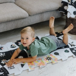 Gyerek habszőnyeg Treflíkek motívumokkal elegáns fekete-fehér dizájnban, extra 1,5 cm vastagsággal, puha és biztonságos felülettel játékhoz és könnyű karbantartással. Nyolc elemből kb. 117 × 60 cm-es felületet állíthatsz össze, illetve kockát vagy alagutat – ideális játékhoz, alkotáshoz és stílusos dekorációként a gyerekszobába.