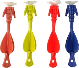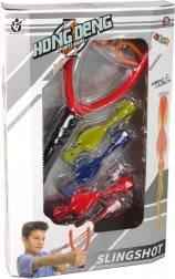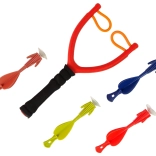 A csomag tartalmaz egy piros csúzlit és négy színes lövedéket tapadókorongokkal, a biztonságos játékért.