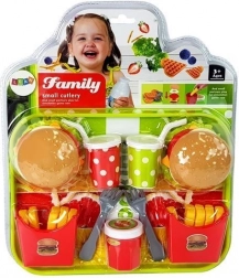 Konyhai játékkészletünk mindent tartalmaz, amire a kicsinek szüksége lehet, hogy csillapítsa éhségét. Lehet, hogy a finomságok látványa téged is játékra csábít! A készlet nagyon hasznos hozzávalókat tartalmaz, amelyeket a kis szakács elkészíthet. A játék legnagyobb szórakozása az összetevők összeállítása úgy, hogy finom és egészséges hamburger készüljön. A készlet elemei lehetővé teszik, hogy a gyermek két személy számára készítsen ételeket.