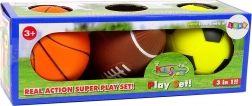 Ez a 3 az 1-ben készlet ideális a gyerekek első sportélményeihez. A labdák puha és kellemes tapintású anyagból készültek, amely kíméletes a kis kezekhez, és biztonságos beltéri és kültéri játékhoz egyaránt. A csapatsportokra jellemző élethű színek és minták aktív mozgásra ösztönzik a gyerekeket, és segítenek kedvenc játékok utánzásában.