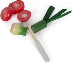 Az élelmiszerek tépőzárral kapcsolódnak, ami lehetővé teszi a "vágást" a mellékelt fa késsel. A gyerekek így főzéssel játszhatnak, mint a felnőttek.