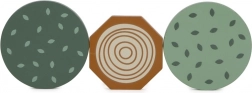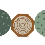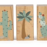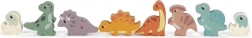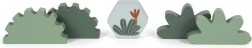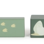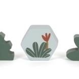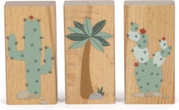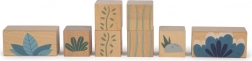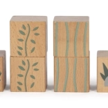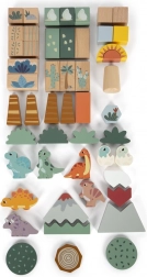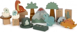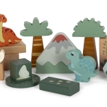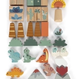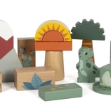A készlet tartalmaz 6 dinoszauruszos kockát és további kockákat fák, hegyek, nap motívumokkal. Minden kocka 100% FSC tanúsítvánnyal rendelkező fából készült, ami biztosítja, hogy az anyag fenntarthatóan kezelt erdőkből származik. A játék a szórakozáson túl ösztönzi a gyerekeket a természet és az ősi világ felfedezésére.