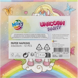 Stílusos papírszalvéták unikornis mintával születésnapi ünnepségekhez, gyerekzsúrokra és tematikus bulikra. A csomag 12 db szalvétát tartalmaz, kiterítve 33 × 33 cm méretben. Praktikus, dekoratív és könnyen kombinálható más díszítésekkel. A termék nem játék.